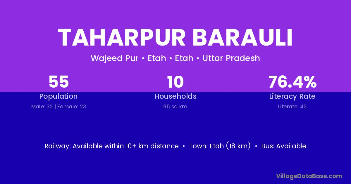 Etah (18 km) is the nearest town to Taharpur Barauli village for major economic activities and is located approximately 18 km away.
