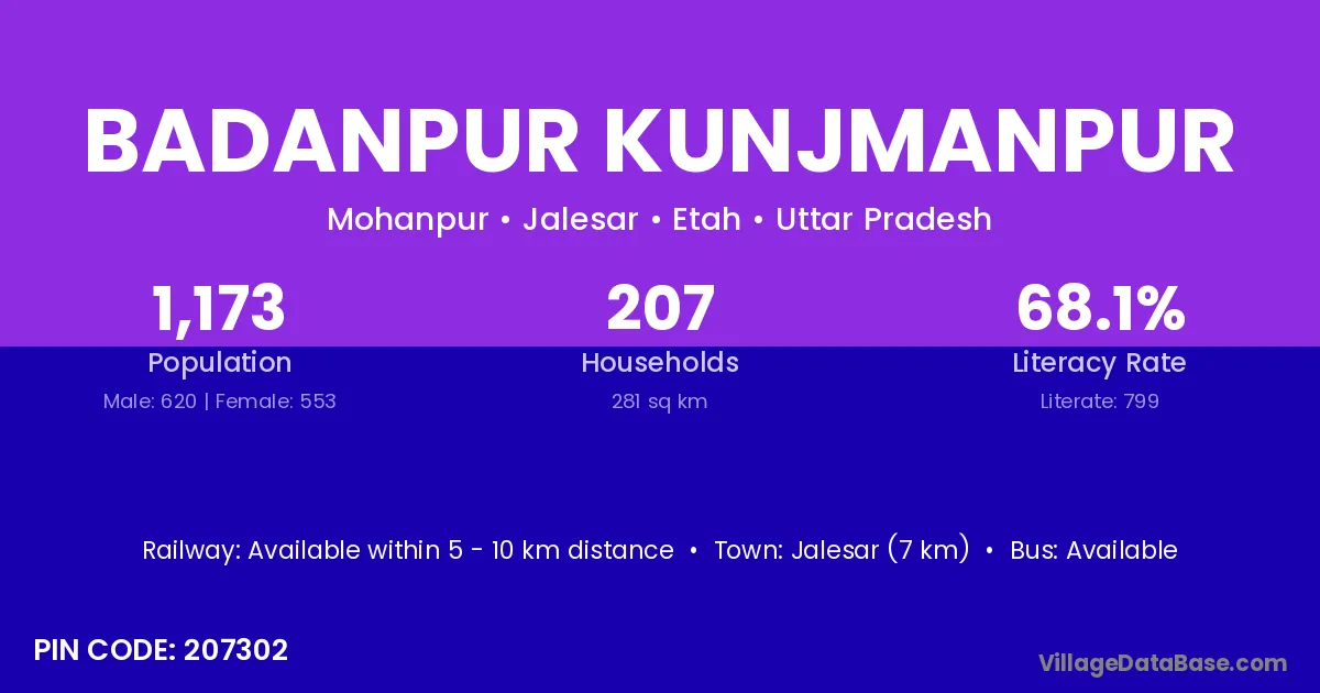 Jalesar (7 km) is the nearest town to Badanpur Kunjmanpur village for major economic activities and is located approximately 7 km away.