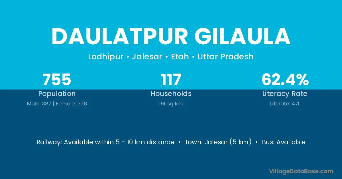 Jalesar (5 km) is the nearest town to Daulatpur Gilaula village for major economic activities and is located approximately 5 km away.