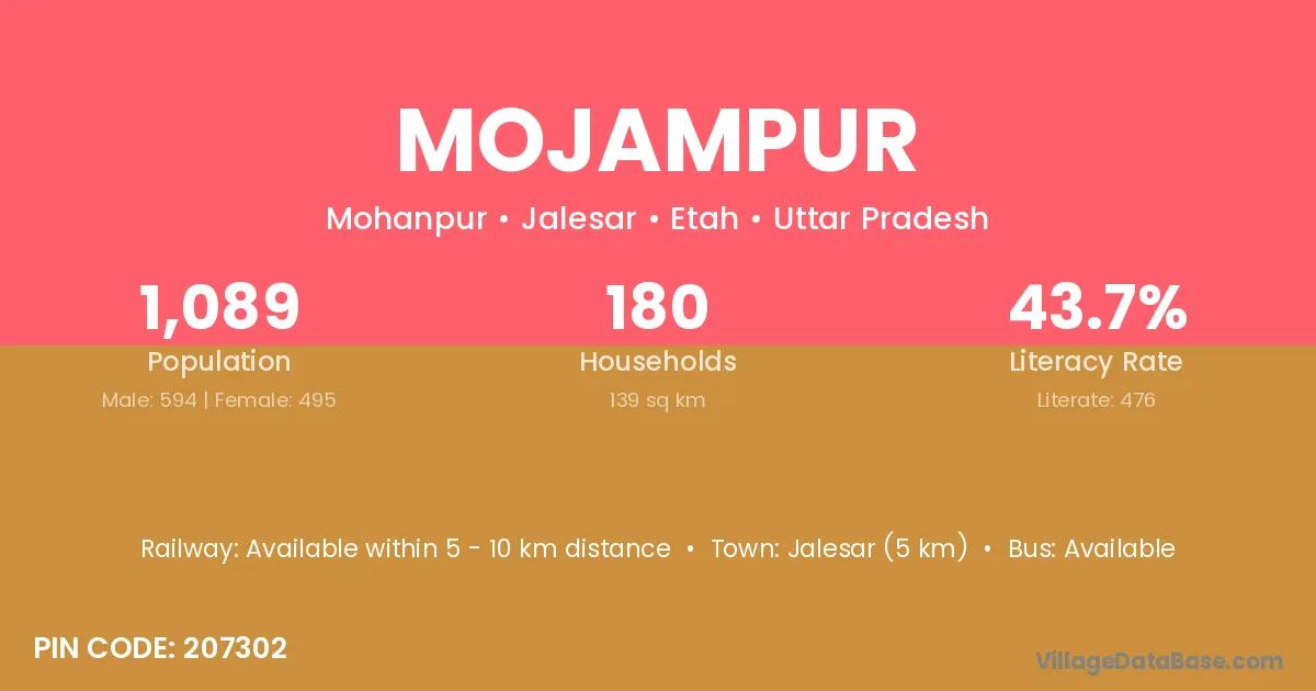 Jalesar (5 km) is the nearest town to Mojampur village for major economic activities and is located approximately 5 km away.