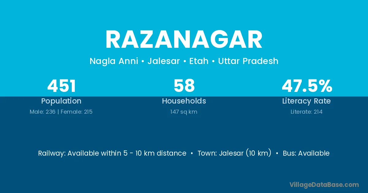 Jalesar (10 km) is the nearest town to Razanagar village for major economic activities and is located approximately 10 km away.