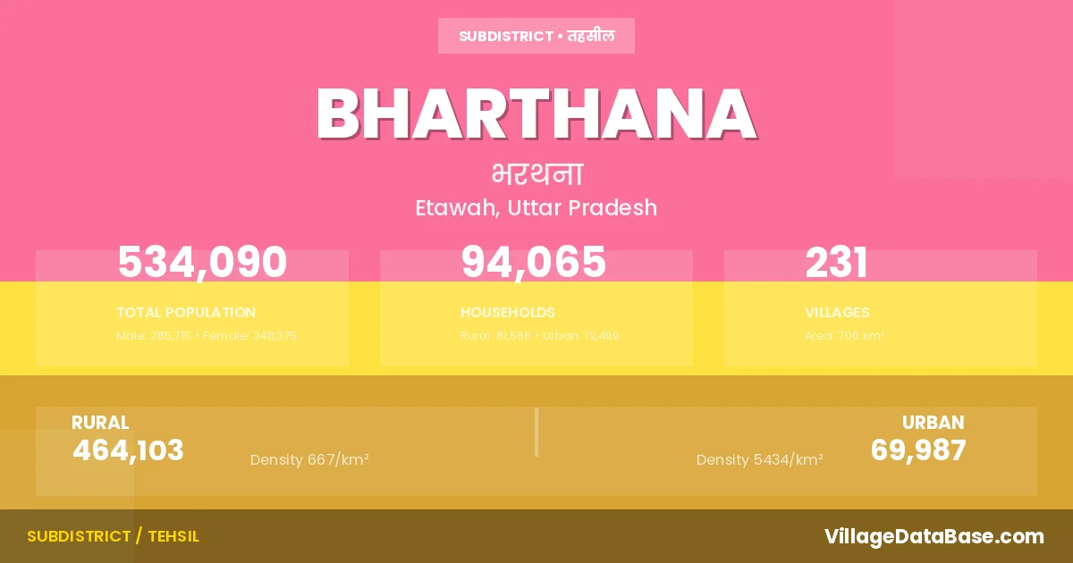 According to the 2011 census The total area of Bharthana Tehsil is 708 km², with a population of 534090 people. The population density is 754 inhabitants per square kilometre, and there are approximately 94065 houses in the sub district.