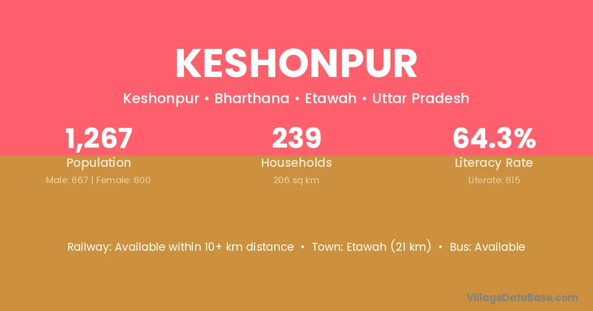 Etawah (21 km) is the nearest town to Keshonpur village for major economic activities and is located approximately 21 km away.