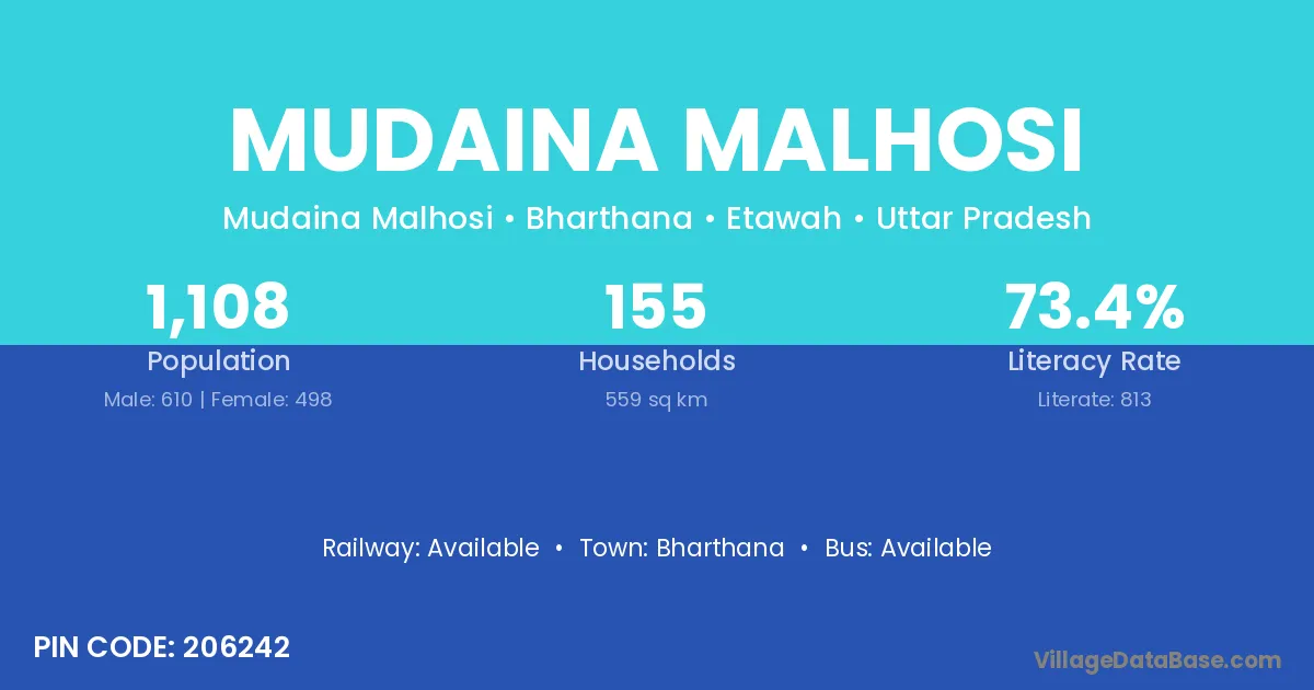 Bharthana is the nearest town to Mudaina Malhosi village for major economic activities
