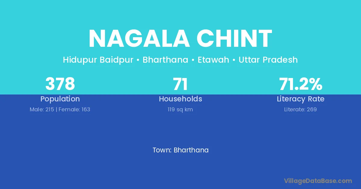 Nagala Chint village has a total population of 378 people, of which 215 are males and 163 are females.
