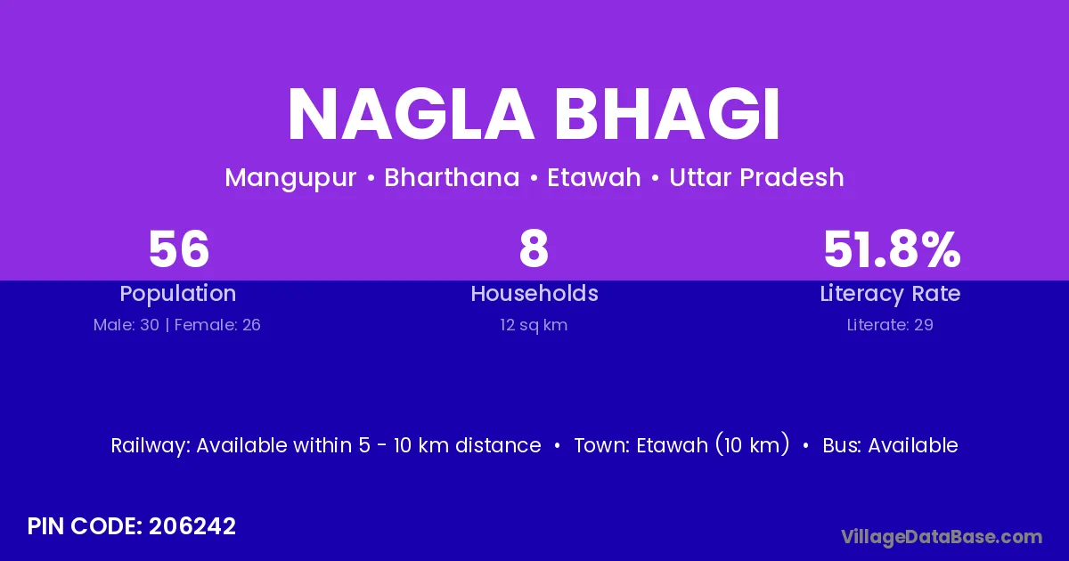 Etawah (10 km) is the nearest town to Nagla Bhagi village for major economic activities and is located approximately 10 km away.