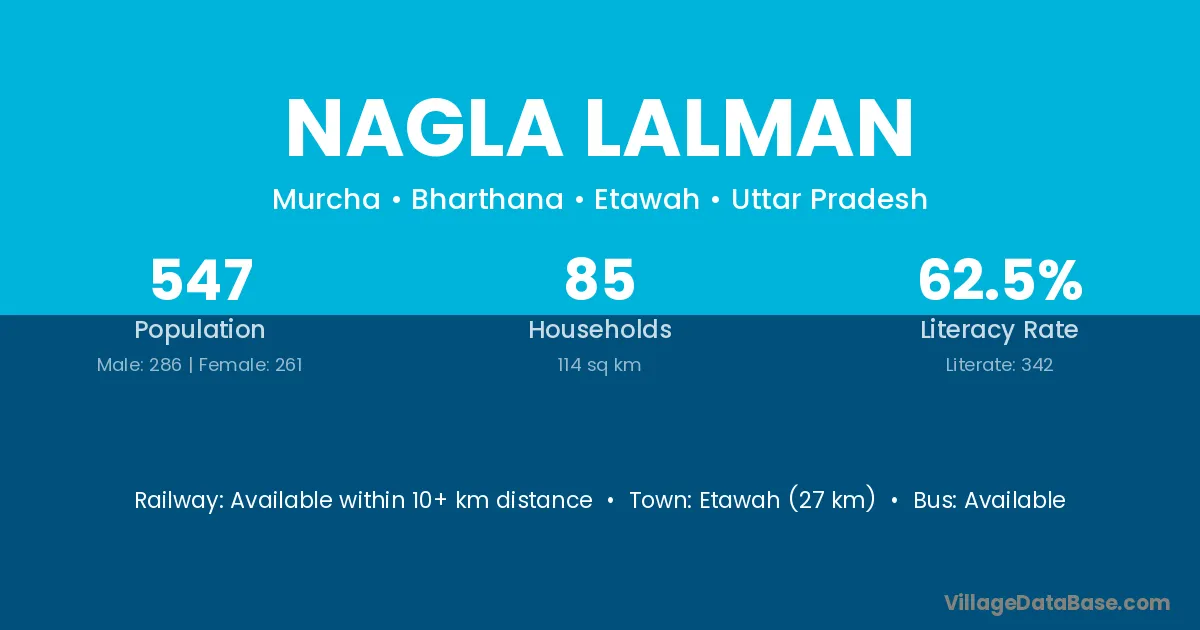 Etawah (27 km) is the nearest town to Nagla Lalman village for major economic activities and is located approximately 27 km away.