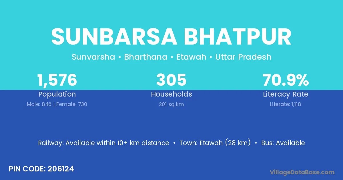 Etawah (28 km) is the nearest town to Sunbarsa Bhatpur village for major economic activities and is located approximately 28 km away.