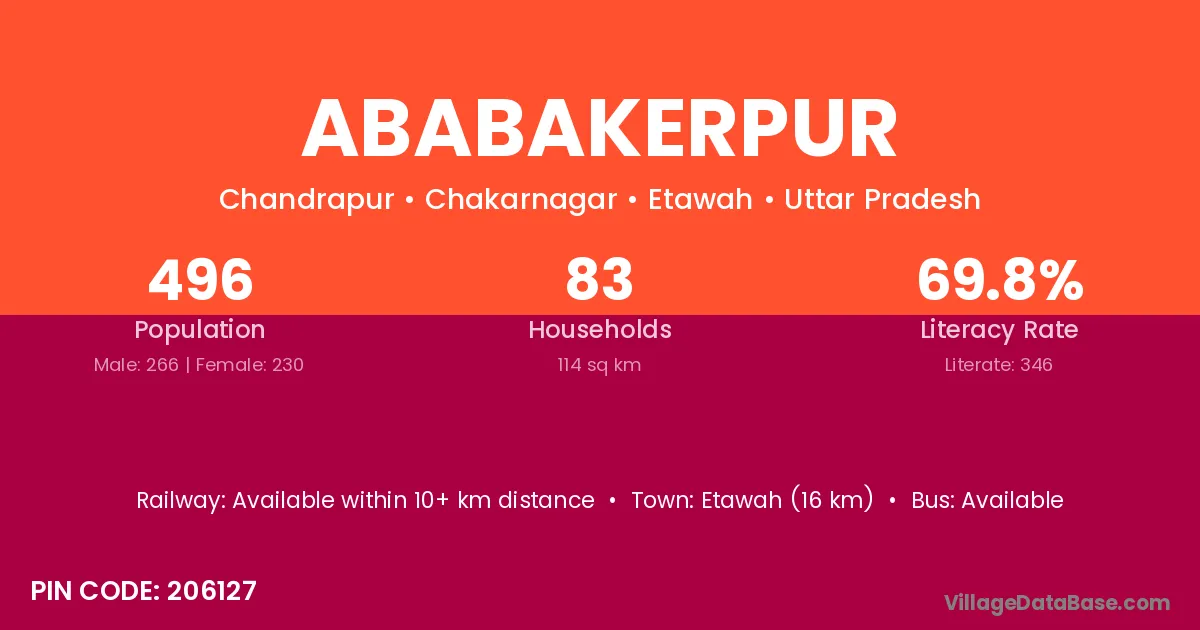 Etawah (16 km) is the nearest town to Ababakerpur village for major economic activities and is located approximately 16 km away.