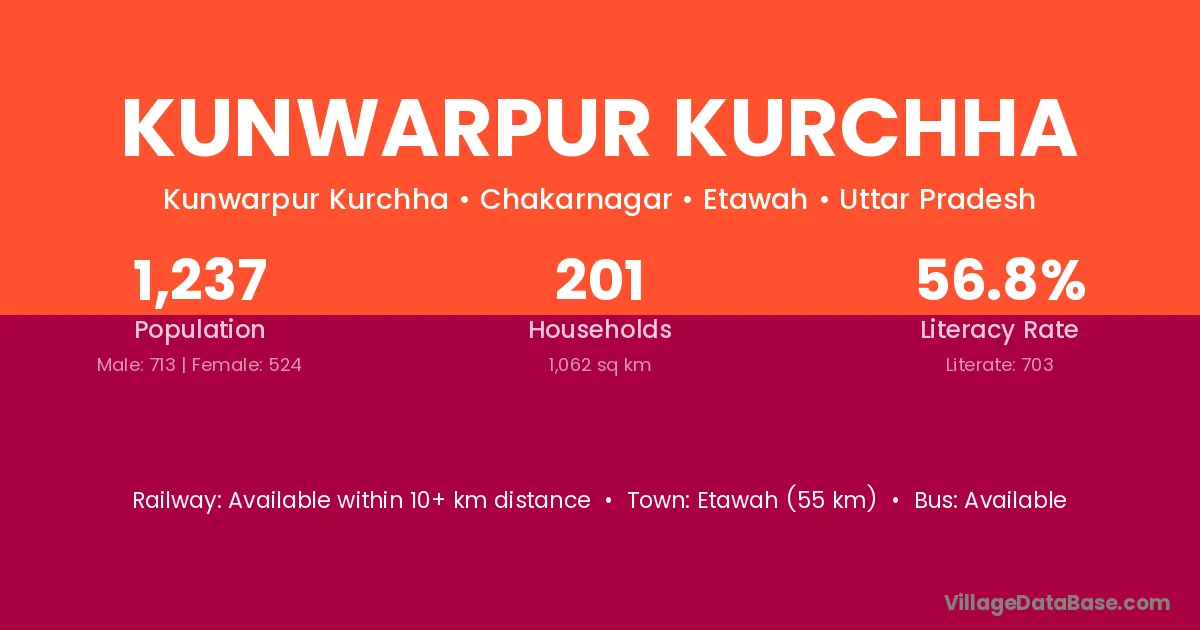 Etawah (55 km) is the nearest town to Kunwarpur Kurchha village for major economic activities and is located approximately 55 km away.