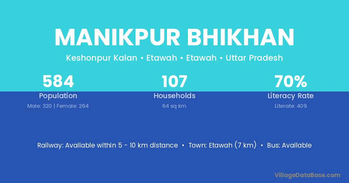 Etawah (7 km) is the nearest town to Manikpur Bhikhan village for major economic activities and is located approximately 7 km away.