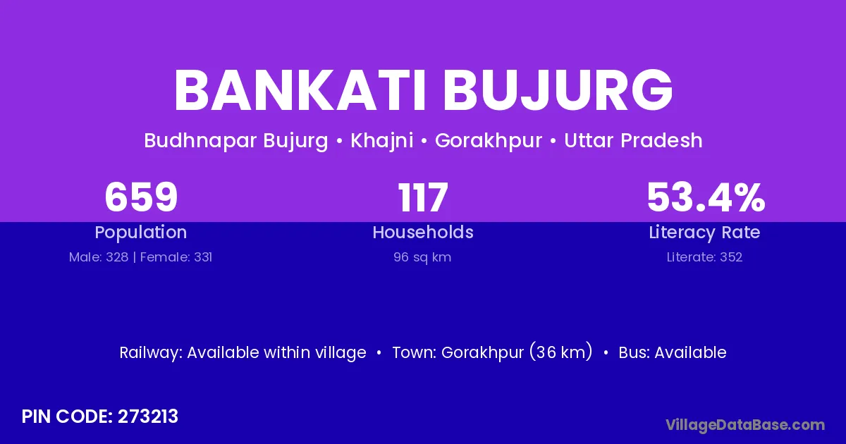 The literacy rate of Bankati Bujurg village is 73.25%. Male literacy stands at 81.20% and female literacy at 63.90%.