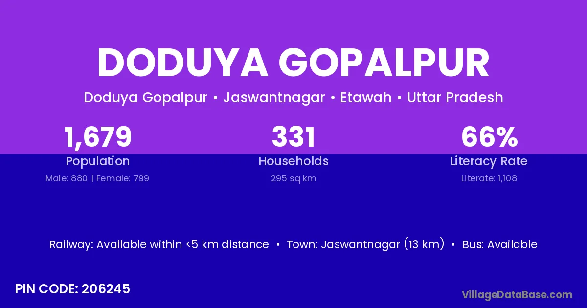 Jaswantnagar (13 km) is the nearest town to Doduya Gopalpur village for major economic activities and is located approximately 13 km away.