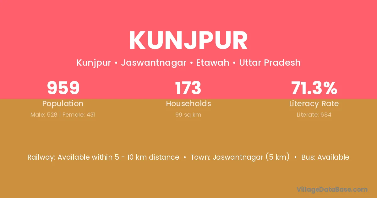 Jaswantnagar (5 km) is the nearest town to Kunjpur village for major economic activities and is located approximately 5 km away.