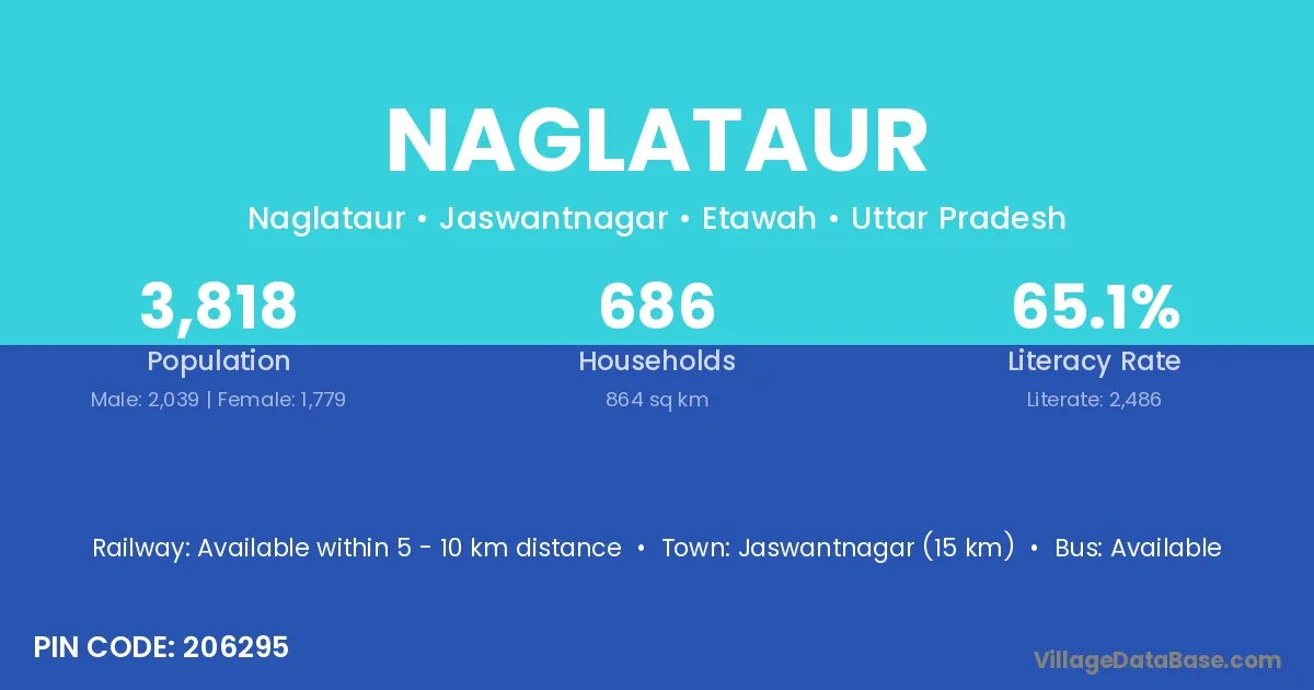 Jaswantnagar (15 km) is the nearest town to Naglataur village for major economic activities and is located approximately 15 km away.