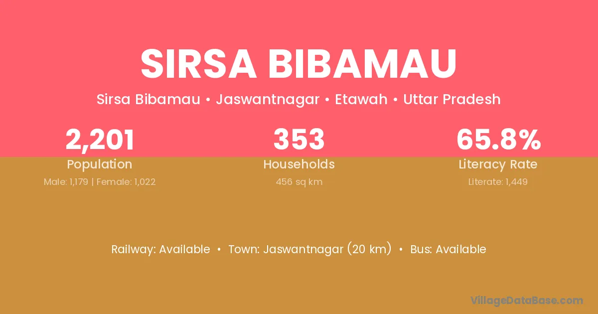 Jaswantnagar (20 km) is the nearest town to Sirsa Bibamau village for major economic activities and is located approximately 20 km away.