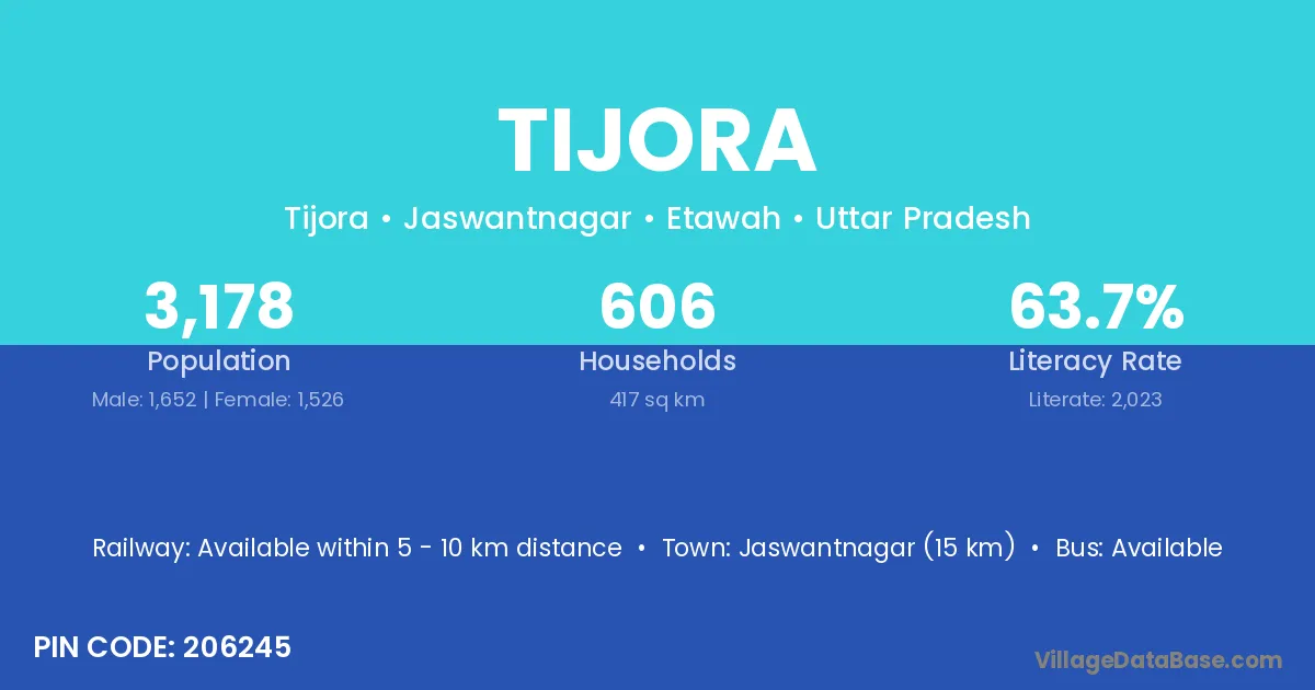 Jaswantnagar (15 km) is the nearest town to Tijora village for major economic activities and is located approximately 15 km away.