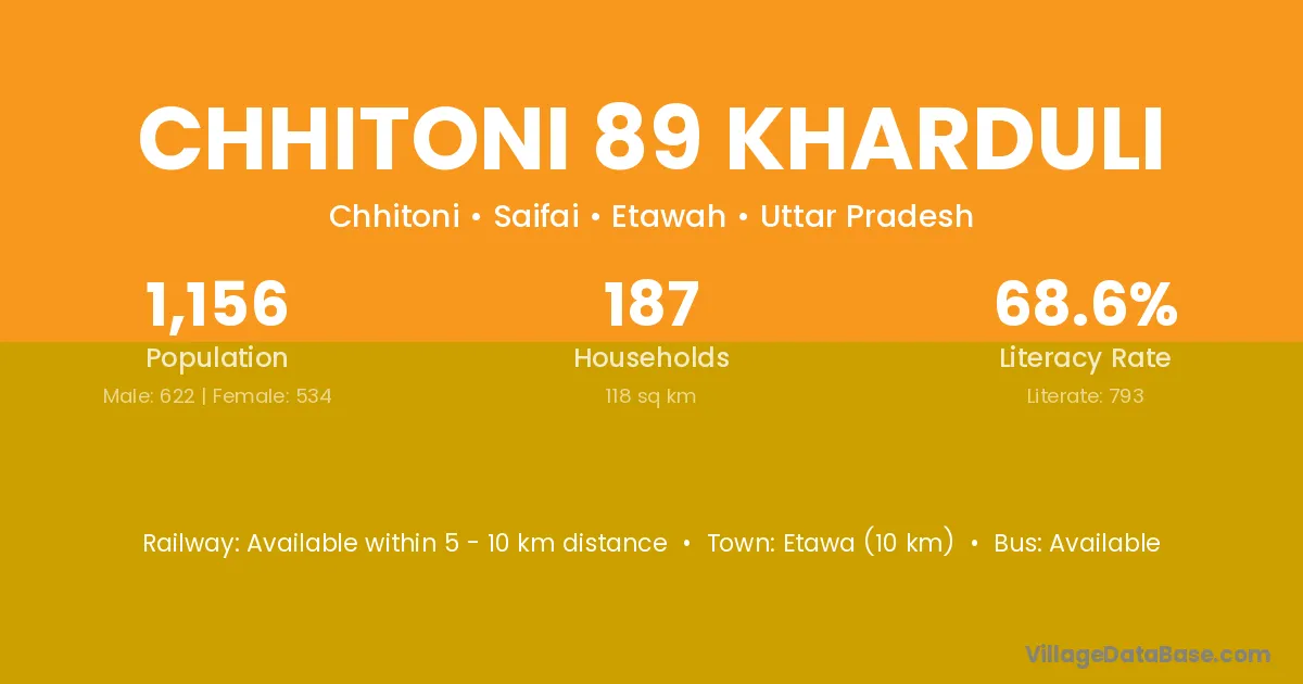 Etawa (10 km) is the nearest town to Chhitoni 89 Kharduli village for major economic activities and is located approximately 10 km away.