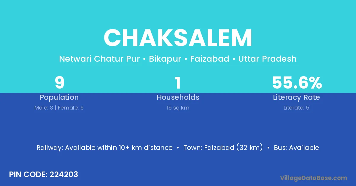 Faizabad (32 km) is the nearest town to Chaksalem village for major economic activities and is located approximately 32 km away.