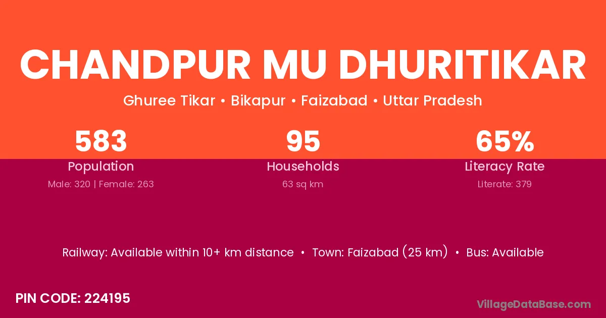 Faizabad (25 km) is the nearest town to Chandpur Mu Dhuritikar village for major economic activities and is located approximately 25 km away.