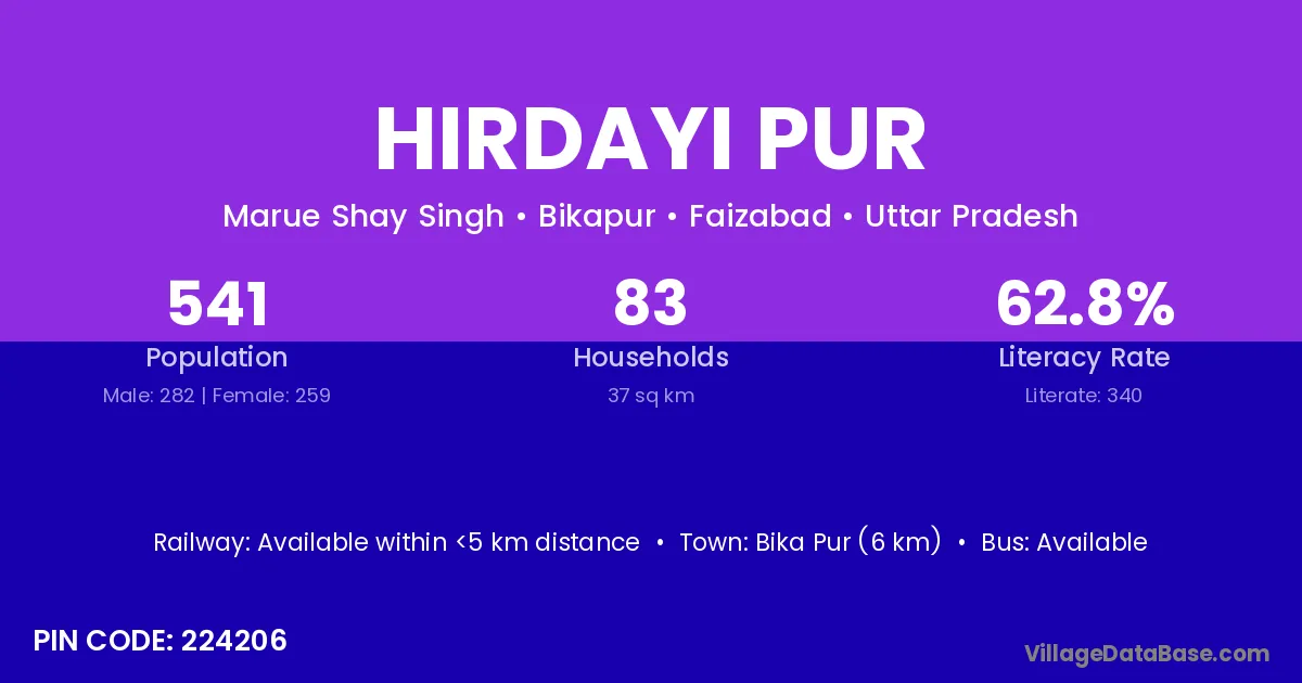 Bika Pur (6 km) is the nearest town to Hirdayi Pur village for major economic activities and is located approximately 6 km away.