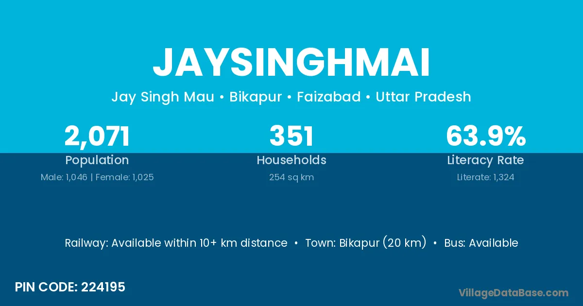 Bikapur (20 km) is the nearest town to Jaysinghmai village for major economic activities and is located approximately 20 km away.