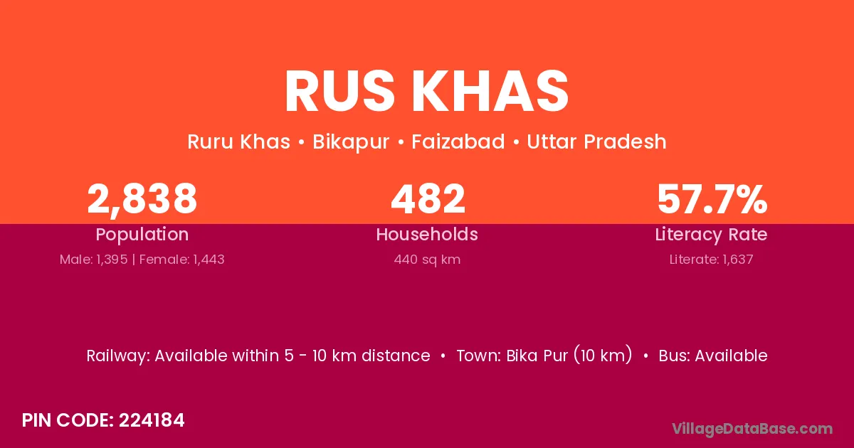 Bika Pur (10 km) is the nearest town to Rus Khas village for major economic activities and is located approximately 10 km away.