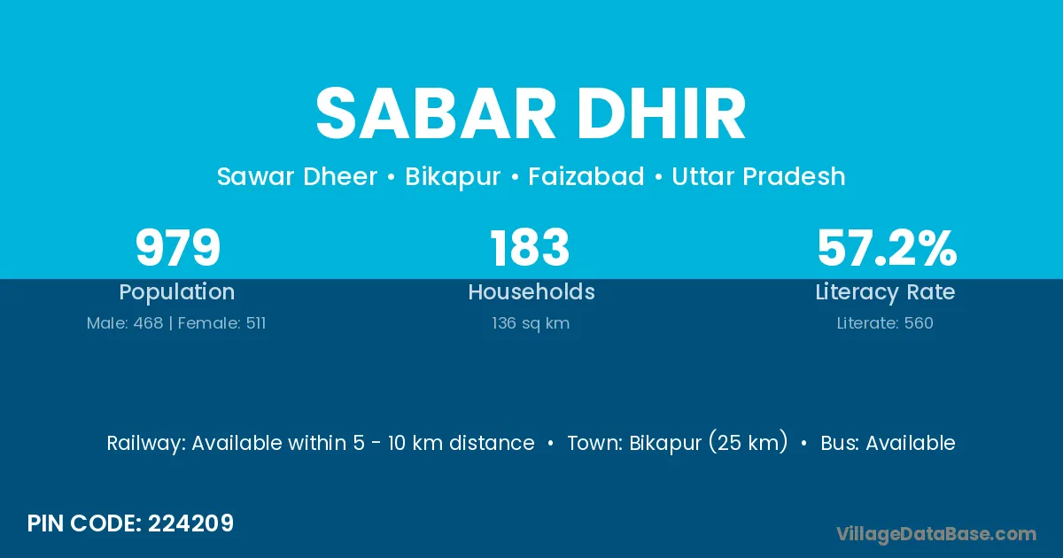 Bikapur (25 km) is the nearest town to Sabar Dhir village for major economic activities and is located approximately 25 km away.