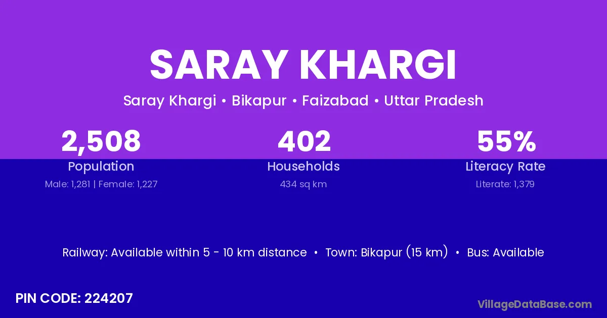 Bikapur (15 km) is the nearest town to Saray Khargi village for major economic activities and is located approximately 15 km away.