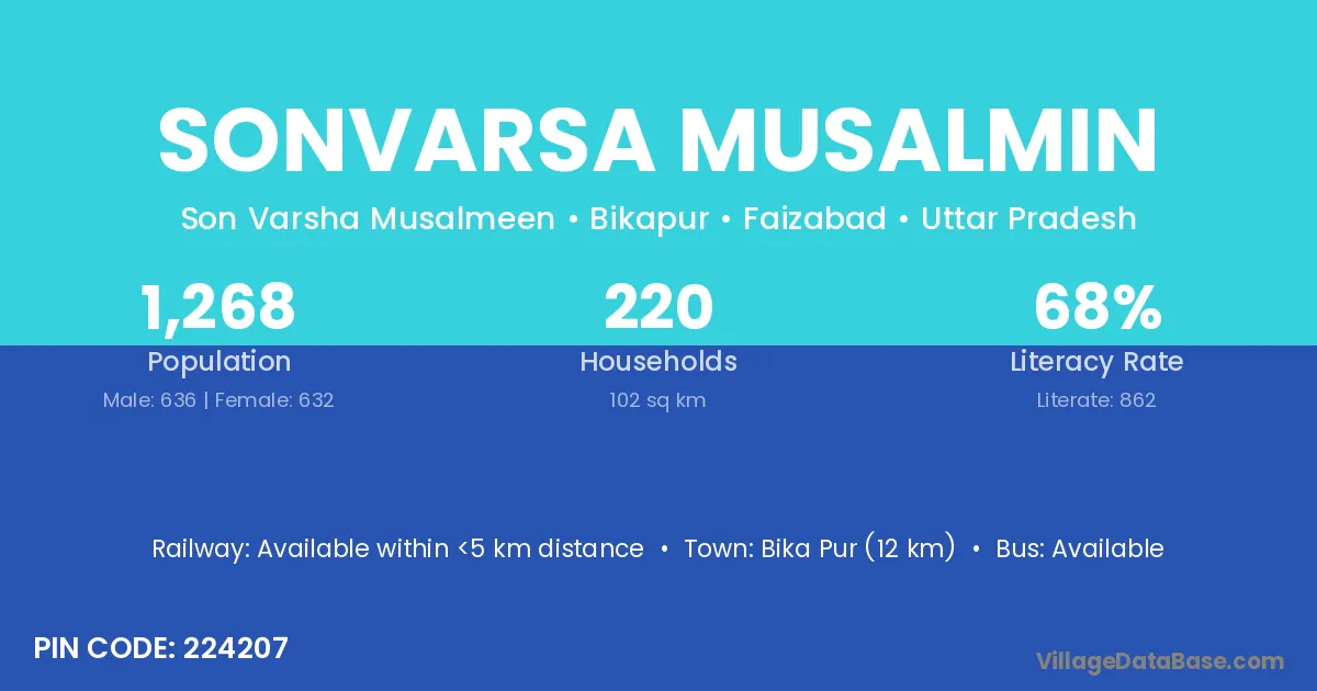 Sonvarsa Musalmin village has a total population of 1,268 people, of which 636 are males and 632 are females.