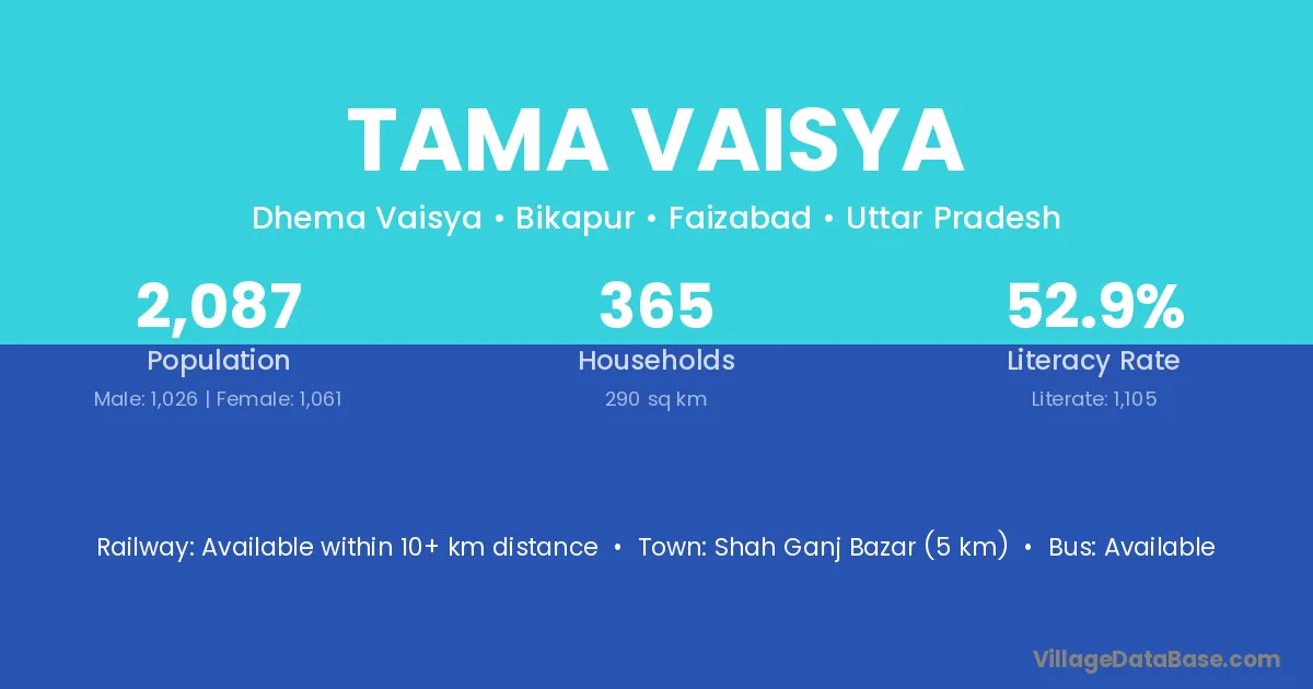 Shah Ganj Bazar (5 km) is the nearest town to Tama Vaisya village for major economic activities and is located approximately 5 km away.