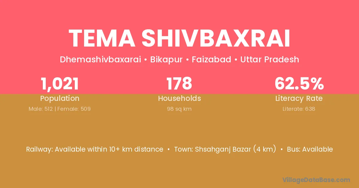 Tema Shivbaxrai village has a total population of 1,021 people, of which 512 are males and 509 are females.
