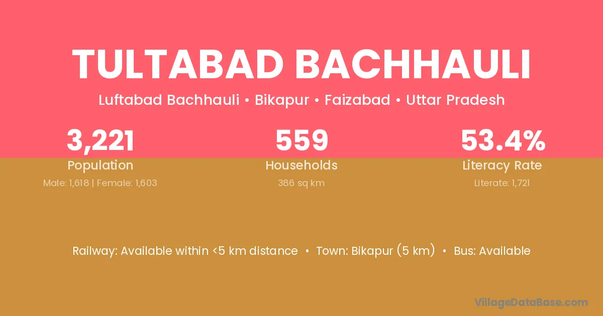 Tultabad Bachhauli village has a total population of 3,221 people, of which 1,618 are males and 1,603 are females.