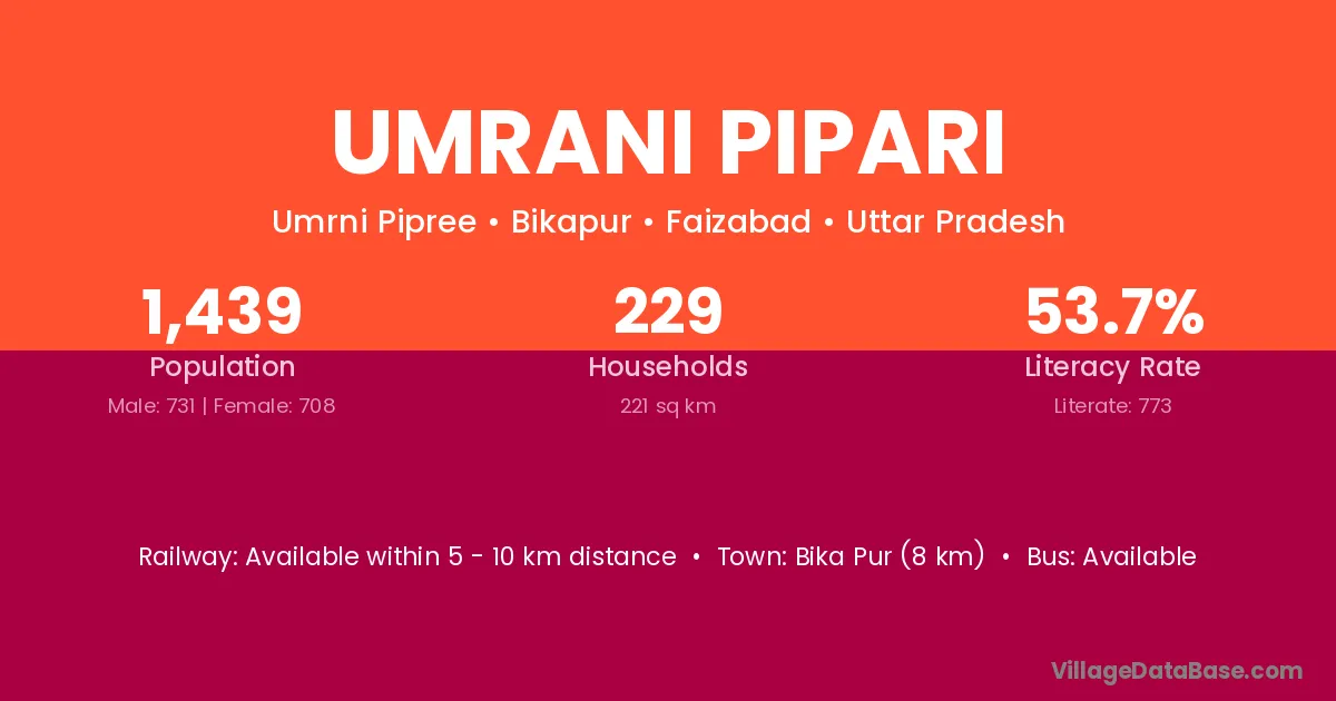 Bika Pur (8 km) is the nearest town to Umrani Pipari village for major economic activities and is located approximately 8 km away.
