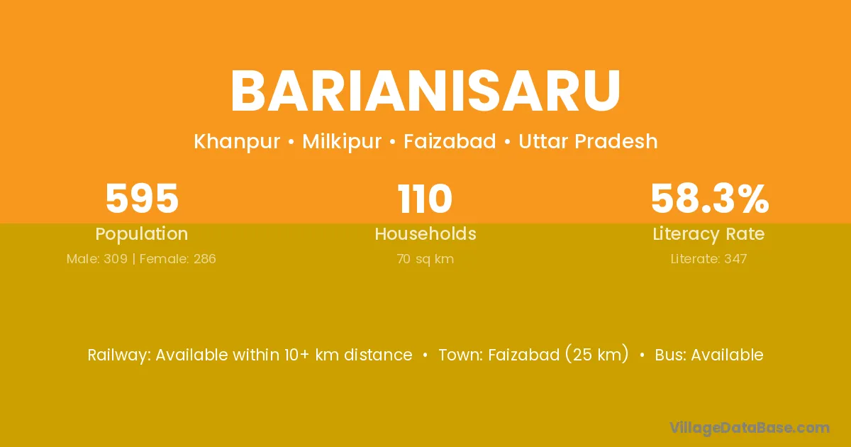 Faizabad (25 km) is the nearest town to Barianisaru village for major economic activities and is located approximately 25 km away.