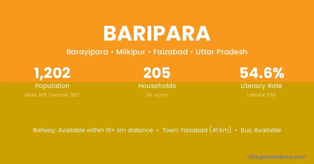 Baripara village has a total population of 1,202 people, of which 615 are males and 587 are females.