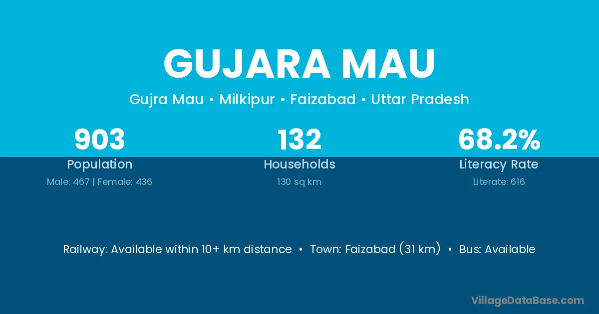 Faizabad (31 km) is the nearest town to Gujara Mau village for major economic activities and is located approximately 31 km away.