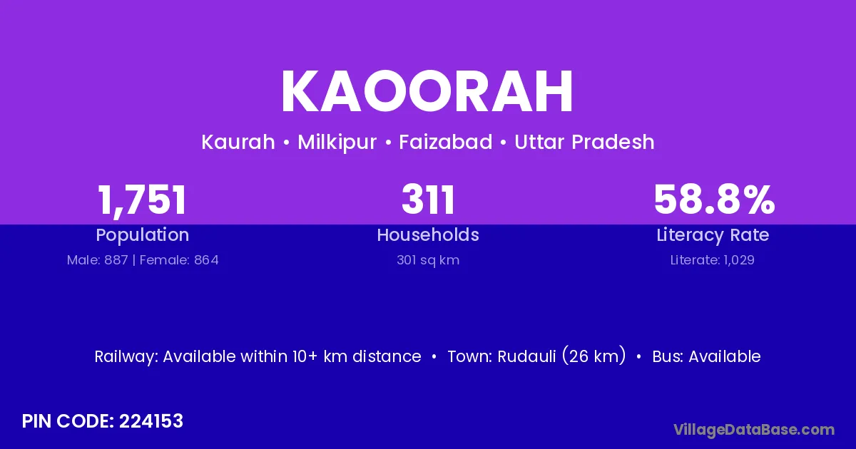 Rudauli (26 km) is the nearest town to Kaoorah village for major economic activities and is located approximately 26 km away.