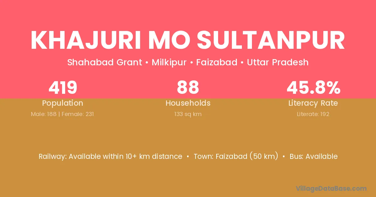 Faizabad (50 km) is the nearest town to Khajuri Mo Sultanpur village for major economic activities and is located approximately 50 km away.