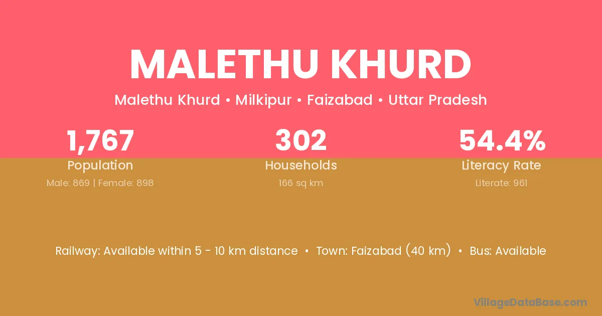 Faizabad (40 km) is the nearest town to Malethu Khurd village for major economic activities and is located approximately 40 km away.