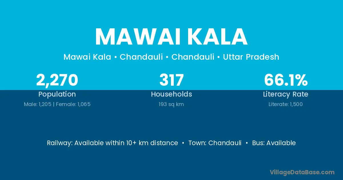 The literacy rate of Mawai Kala village is 60.25%. Male literacy stands at 69.76% and female literacy at 51.20%.