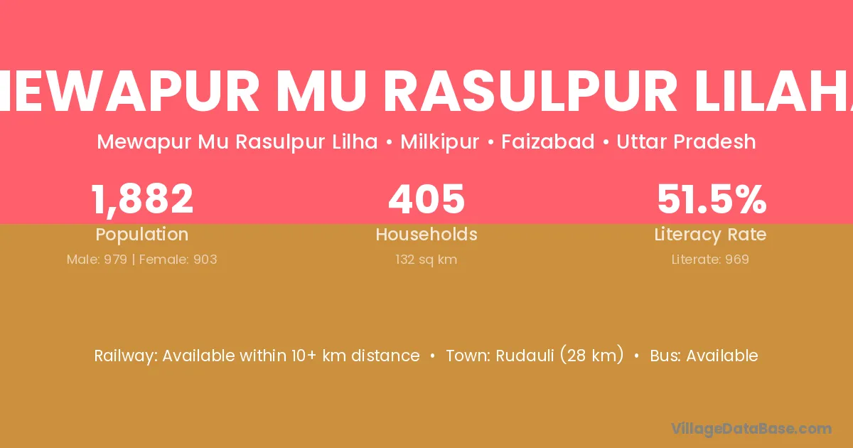 Mewapur Mu Rasulpur Lilaha village has a total population of 1,882 people, of which 979 are males and 903 are females.