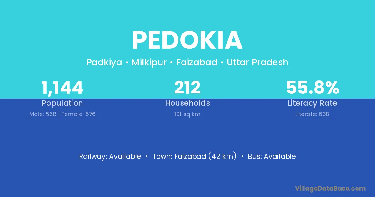 Faizabad (42 km) is the nearest town to Pedokia village for major economic activities and is located approximately 42 km away.