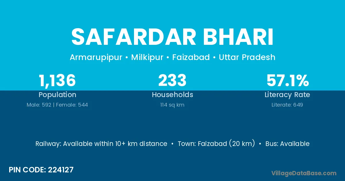 Faizabad (20 km) is the nearest town to Safardar Bhari village for major economic activities and is located approximately 20 km away.