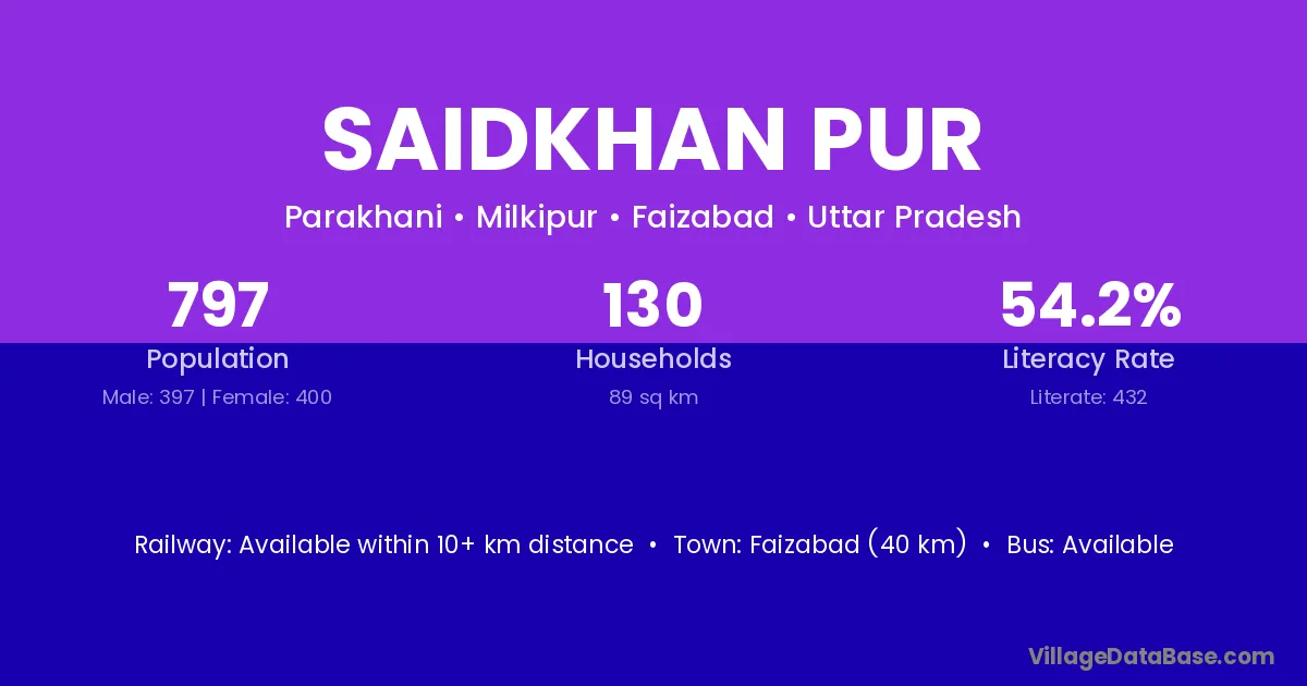 Faizabad (40 km) is the nearest town to Saidkhan Pur village for major economic activities and is located approximately 40 km away.