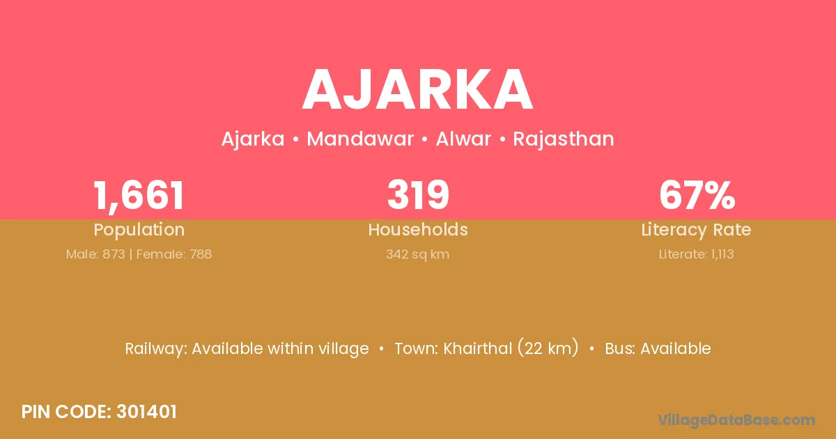 The literacy rate of Ajarka village is 60.24%. Male literacy stands at 74.82% and female literacy at 41.82%.