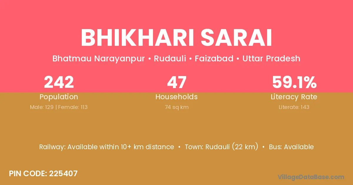 Rudauli (22 km) is the nearest town to Bhikhari Sarai village for major economic activities and is located approximately 22 km away.