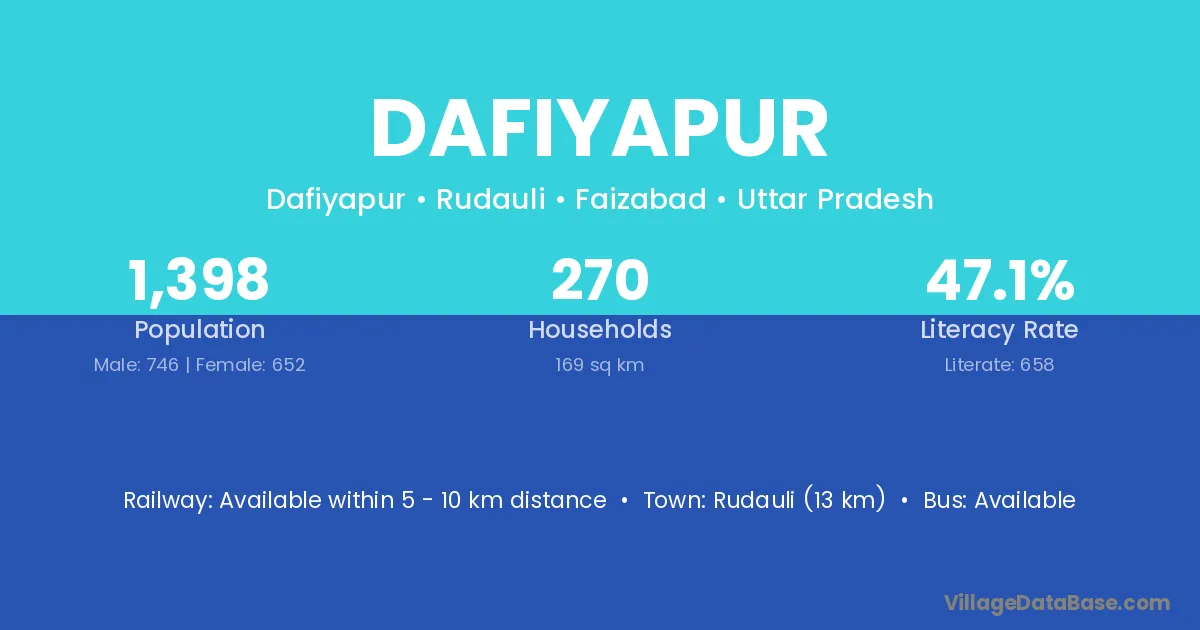 Rudauli (13 km) is the nearest town to Dafiyapur village for major economic activities and is located approximately 13 km away.