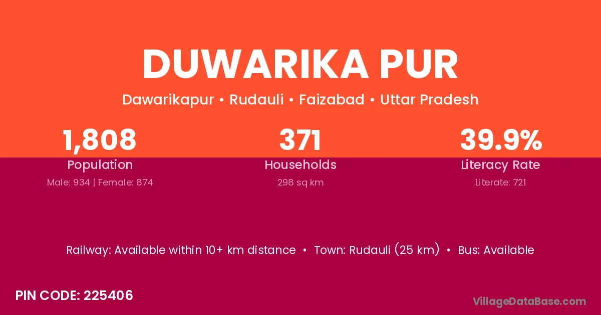 Rudauli (25 km) is the nearest town to Duwarika Pur village for major economic activities and is located approximately 25 km away.