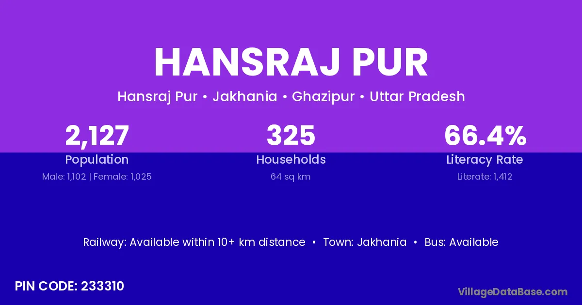 Hansraj Pur village has a total population of 2,189 people, of which 1,148 are males and 1,041 are females.